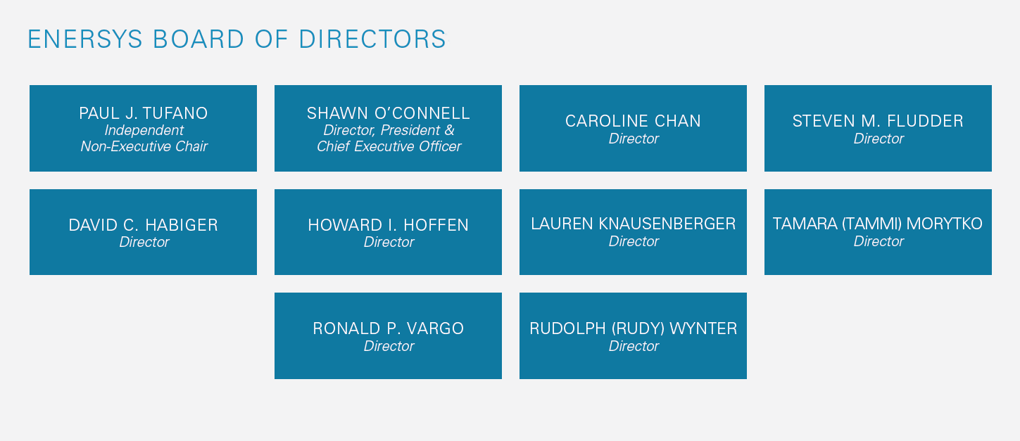 With over a century of leadership in energy storage and power systems, EnerSys has earned its reputation through strong corporate governance. Our Board of Directors guides long-term strategy, ensures accountability, and oversees risk and operational integrity. Members are selected for their leadership, sound judgment, and expertise in global business, technology, and industry. Each brings real-world experience and a shared commitment to the values that propel EnerSys forward. This governance framework underpins our mission to deliver lasting value to shareholders, customers, employees, and communities.
