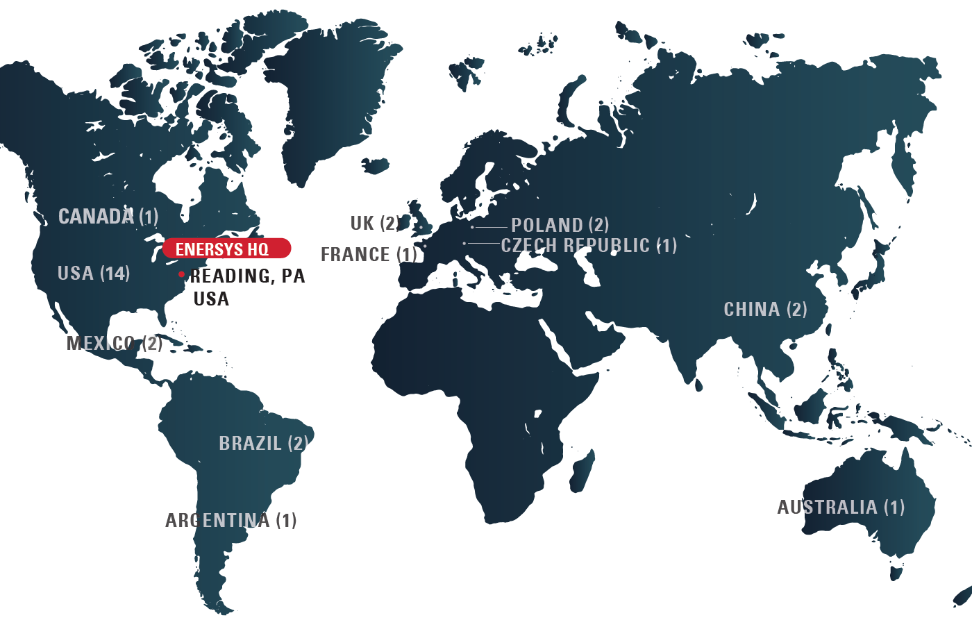 EnerSys has been a global leader in stored energy solutions for industrial applications for over 100 years. EnerSys is a publicly traded company with nearly 11,000 employees across four continents. Headquartered in Reading, PA, with additional regional headquarters in Europe, Middle East and Africa, and Asia, our manufacturing and operations serve over 10,000 customers worldwide and bring stored energy solutions and systems to over 100 countries.